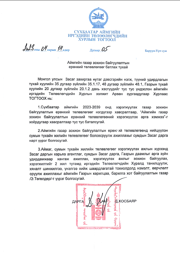 5 | Хэсэгчилсэн ерөнхий төлөвлөгөө батлах тухай ИТХ-ын ТОГТООЛ | 2023-06-27 | 08 |